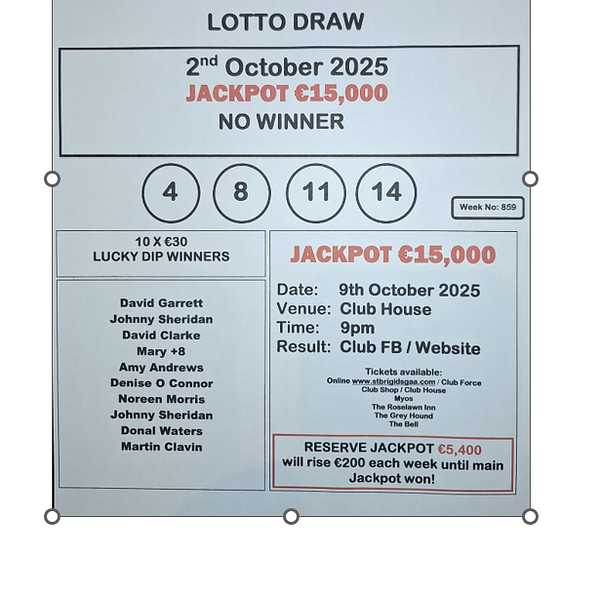 There was no Jackpot winner in tonight's Draw. The Jackpot remains at €15,000 for our next draw on the 9th October with the reserve Jackpot rising to €5,400.