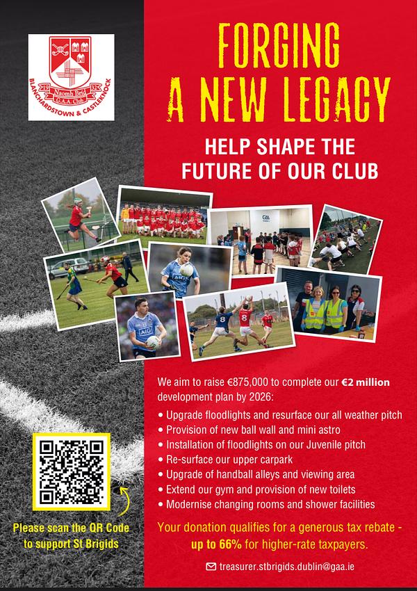 Remember: donations of €250 or more qualify for a 66% tax rebate back to the club — turning your gift into something even bigger. Please see attached a pledge form which can be filled out and returned to the club along with your payment or click on https://www.stbrigidsgaa.com/wp-pledge-form/ or the QR code below which will bring you straight to our online donation page. All forms have explainers on how the tax scheme works.