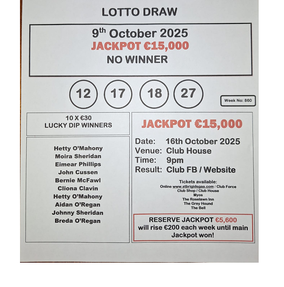 There was no Jackpot winner in tonight's Draw. The Jackpot remains at €15,000 for our next draw on the 16th October with the reserve Jackpot rising to €5,600.