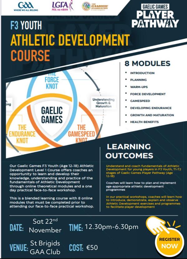 St. Brigid’s are running a Youth Athletic Development Level 1 course aimed at mentors of F3 groups (U13 to Minor, all codes).