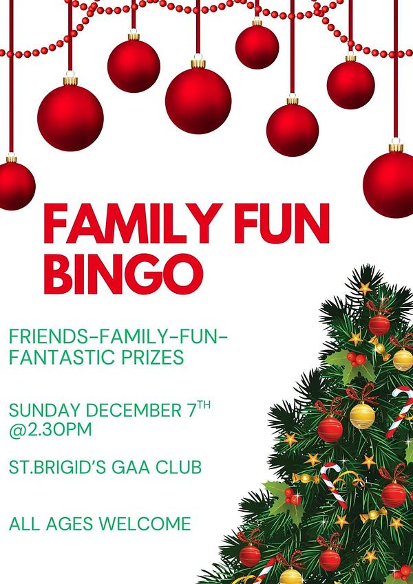 Get ready for an afternoon of festive fun at St Brigid’s GAA Club as our Family Fun Bingo returns on Sunday, December 7th at 2.30pm! Bring your family and friends for a great day packed with laughter, fantastic prizes, and plenty of Christmas cheer. 🎁✨