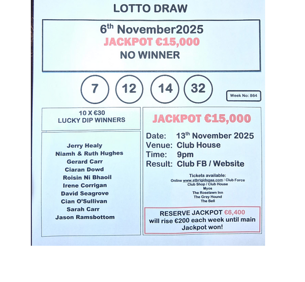 There was no Jackpot winner in tonight's Draw. The Jackpot remains at €15,000 for our next draw on the 13th November with the reserve Jackpot rising to €6,400.
