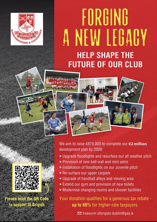 Remember: donations of €250 or more qualify for a 66% tax rebate back to the club — turning your gift into something even bigger. Please see attached a pledge form which can be filled out and returned to the club along with your payment or click on https://www.stbrigidsgaa.com/wp-pledge-form/ or the QR code below which will bring you straight to our online donation page. All forms have explainers on how the tax scheme works.