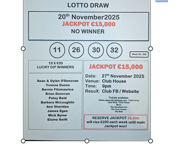 There was no Jackpot winner in tonight's Draw. The Jackpot remains at €15,000 for our next draw on the 27th November with the reserve Jackpot rising to €6,800.