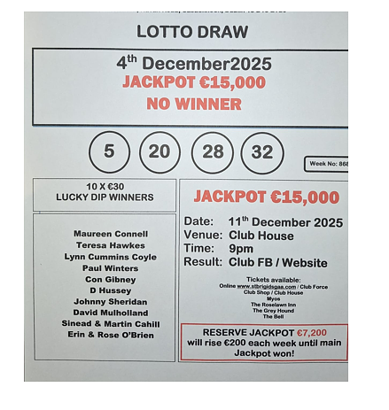 There was no Jackpot winner in tonight's Draw. The Jackpot remains at €15,000 for our next draw on the 11th December with the reserve Jackpot rising to €7,200.