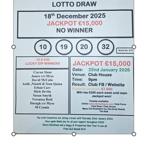 The Lotto Committee would like to thank you for your support throughout 2025 and to wish you all a Merry Christmas and a Happy New Year.