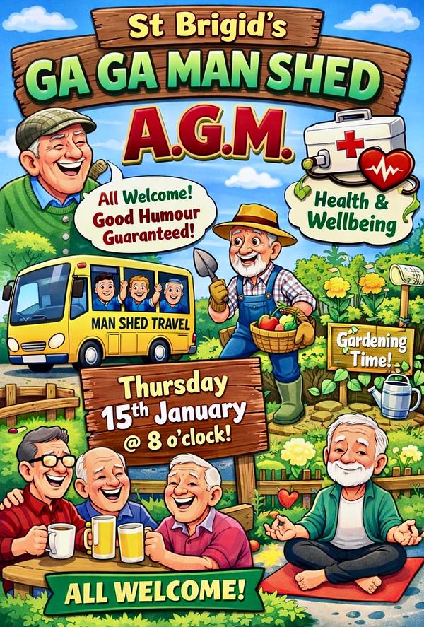 A.G.M. for the Ga Ga Man Shed will take place next Thursday night the 15th of January 2026 @ 8 o’clock in the Man shed.