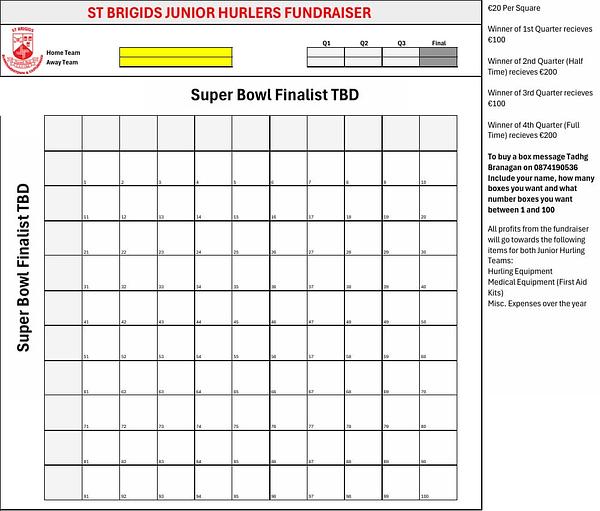 The St. Brigids Junior Hurlers are running a Super Bowl Box fundraiser (with the Super Bowl taking place on the 8th February)