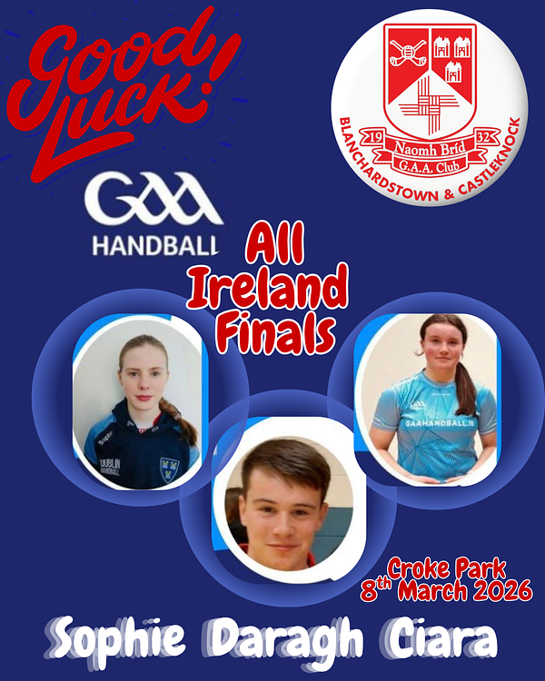 Naomh Bríd GAA Club would like to extend huge congratulations and best wishes to Daragh, Ciara and Sophie, who have all qualified for the All-Ireland Handball Finals in their respective age groups.