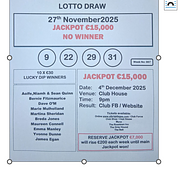 There was no Jackpot winner in tonight's Draw. The Jackpot remains at €15,000 for our next dra...