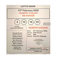 There was no Jackpot winner in tonight's Draw. The Jackpot remains at €15,000 for our next dra...